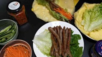 4. 卷制牛肉卷:将腌制好的牛肉片铺平,放上蔬菜丝,卷起来即可。